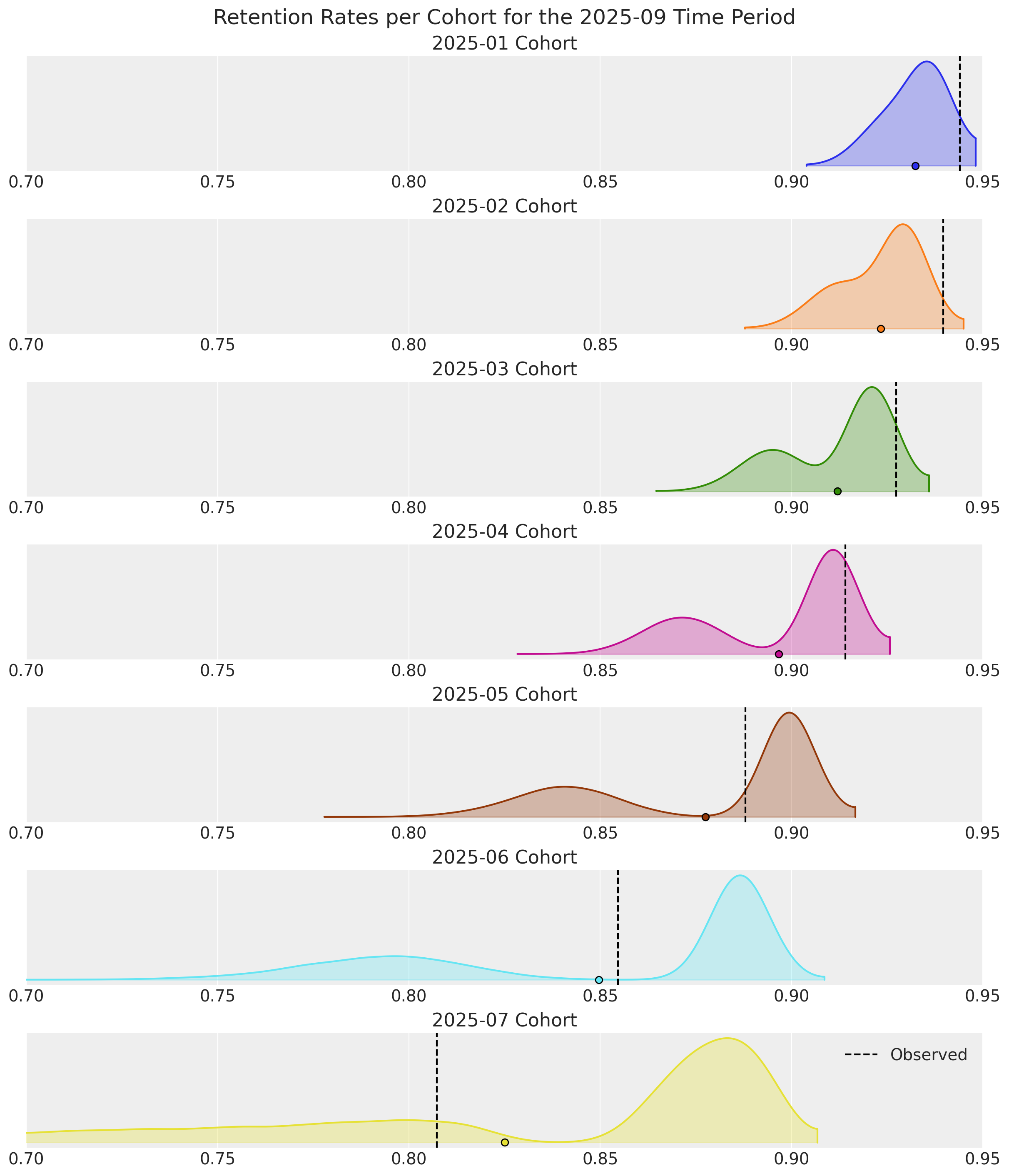 Retention elasticity is higher for earlier, long-running cohorts, but these retention rates also approach 95%. If retention were to be increased by just 5% for Regular customers in the 2025-07 cohort, their respective remaining lifetimes could be 25% longer!