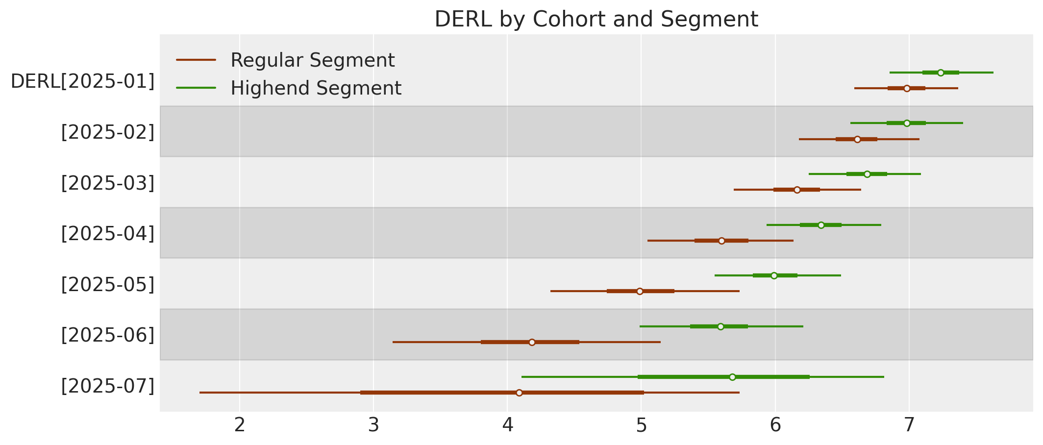 We can see the segment DERL estimates in the later cohorts are quite different and broadly distributed, but over time variance decreases and segments become more similar.