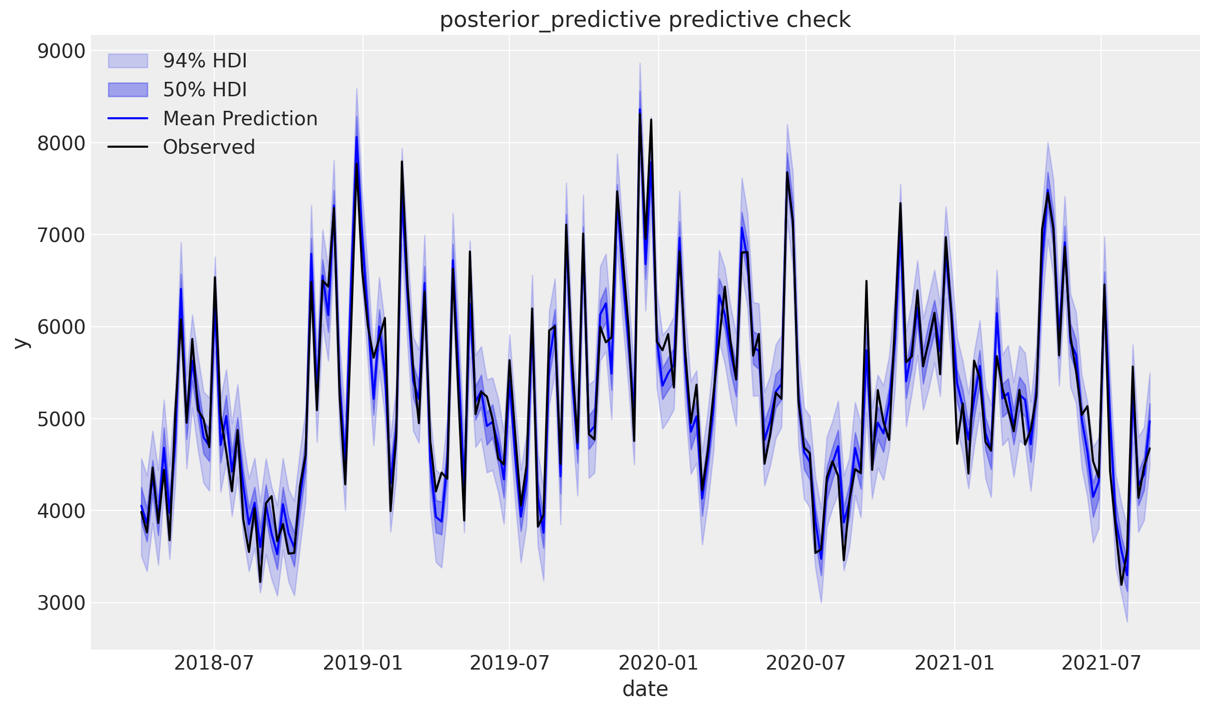 The model captures the observed data well if the black dots (actual sales) fall within the shaded uncertainty bands.